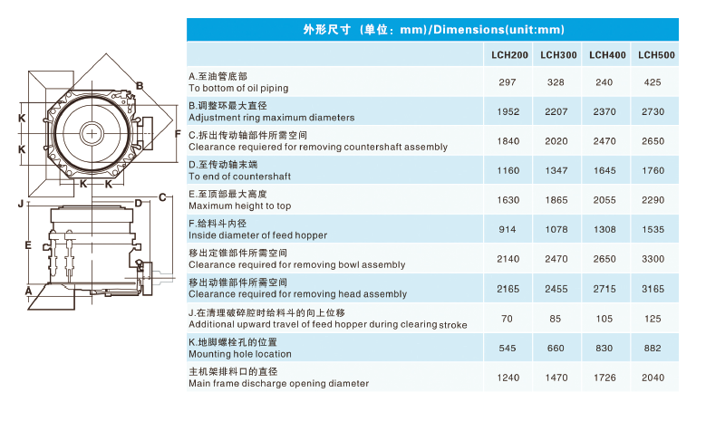 LCH 系列圓錐破碎機只需更換定錐襯板、動錐襯板、適配環(huán)和楔塊螺栓,即可將破碎腔型在短頭超細(xì)到標(biāo)準(zhǔn)超粗之間任意轉(zhuǎn)換。