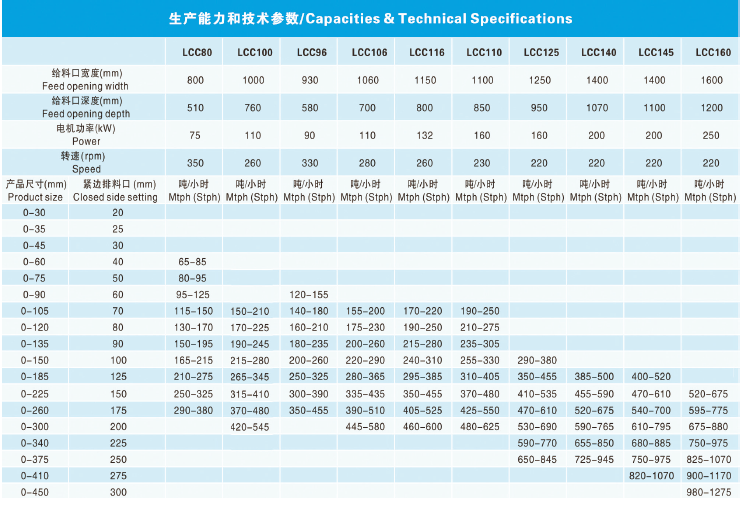 以上數(shù)據(jù)所表示的破碎機(jī)產(chǎn)量,是針對(duì)平均比重為 2.7t/m 3 ,給料能夠順利進(jìn)入破碎腔、無(wú)架橋卡堵現(xiàn)象,給料剔除小于排礦口細(xì)料時(shí)取小值,含細(xì)料時(shí)取大值。產(chǎn)量可能隨給料方式和物料性質(zhì)諸如粒度組成、含水含泥量、松散密度和可碎性而變化。